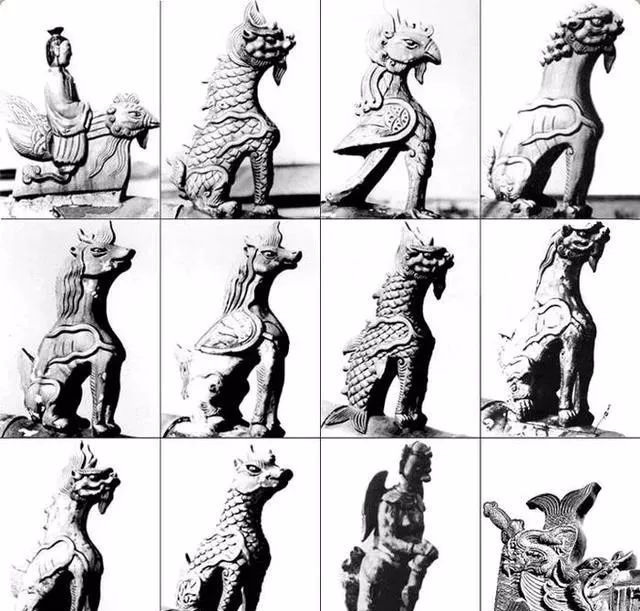 屋脊上的蹲獸,除卻上文中提到***常見的狻猊、斗牛、獬豸、鳳、狎魚五種,根據建筑物的不同還有其他種類,比如北京故宮太和殿上有十種之多。重脊的頂端為騎鳳仙人,后面依次排列鴟吻、獅子、天馬、海馬、狻猊、狎魚、獬豸、斗牛、行什。除了獅子、海馬,這些蹲獸都是神話中的動物,各有出身傳說,不同的象征昭示了古人對其在安宅保家中寄托的愿望。