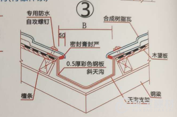 1 斜天溝安裝示意圖如下。