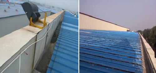 該部位漏水的主要原因是:屋面外板安裝未加泡沫堵頭,屋面外板未下翻;墻面外板長(zhǎng)度不足,且檐口部位未加防水收邊。