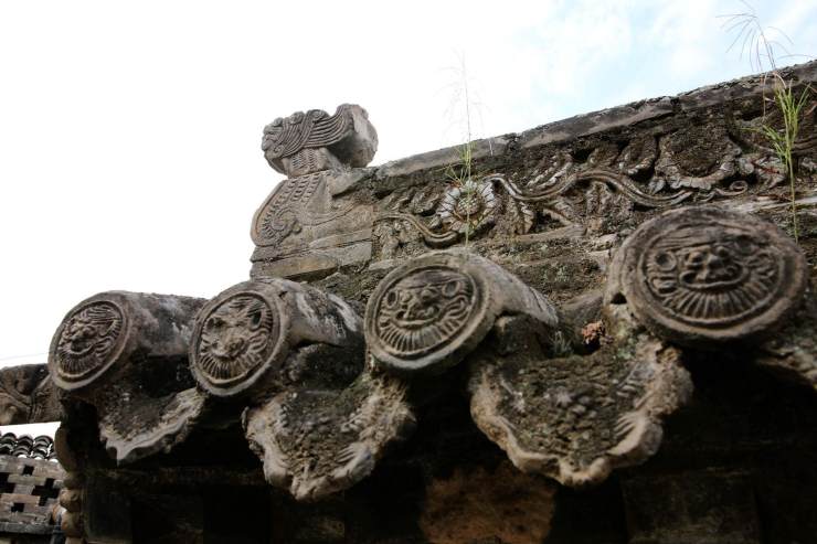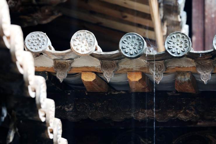 聰慧的中國工匠們利用樸實小瓦做出各種瓦花墻。杭州城永福寺的瓦花墻內墻外風光旖旎。晉中票號的東家們使用瓦花防盜,精湛技藝的匠人疊小瓦層層相扣成銅錢形,日常是票號的裝飾,任風吹雨打,瓦自巋然不動。若是蟊賊攀爬,在不均勻受力作用下,瞬間分化瓦解。紅河建水的黃氏宗祠小青瓦對花成屋脊,別樣姿容。