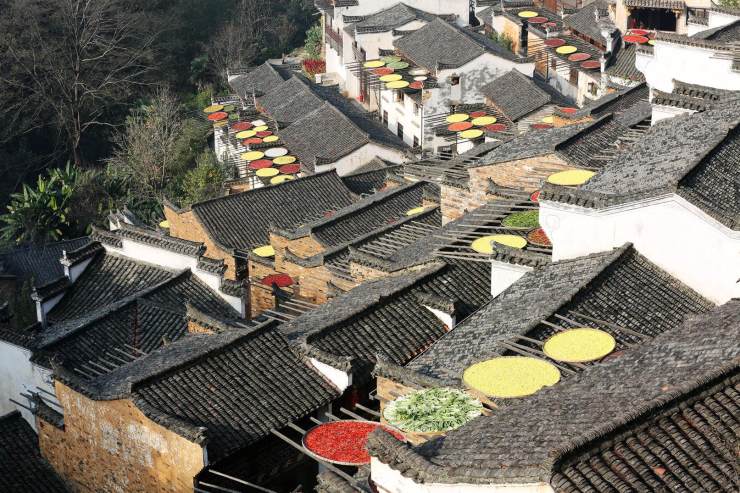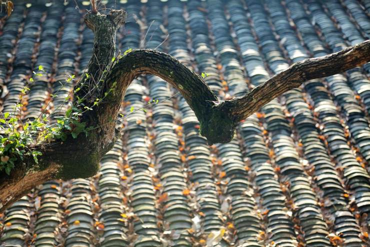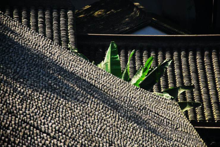 單說用量多寡,小青瓦當屬老大,她還有個美麗的別名蝴蝶瓦,又名陰陽瓦,廣泛應用在屋宇建筑上,江南江北身影重重。江西婺源人家屋頂黛色板瓦,因著大塊艷麗秋色,華美跳躍。六和塔下房屋間逸出一叢芭蕉,不知是瓦因著芭蕉清新,還是芭蕉因著青瓦含蓄。秋至皖南,人家的房頂落葉覆蓋,雨過天晴水汽縈繞恍惚出水墨顏色。靜升王家單色青瓦覆頂,不著異色卻整整當得起民間故宮名頭。甪直古鎮青磚小瓦馬頭墻,隱含著書香門第的典雅。河街并行的婉約水鄉,那屋瓦也文靜靈秀款款深情。年幼時膠東老家的青黛小瓦,比著當下張揚的大紅瓦多了古遠深邃跟幽謐。