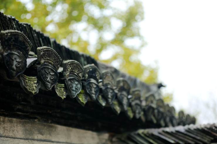 屋脊獸飾的總稱吻獸,吻獸跟挑角多彩當屬寺廟祠堂建筑上,挑角又名翅角、撓角。平遙古城深藏著珍稀的人物驅獸屋脊圖。昆明圓通寺屋頂正中的寶塔氣派端正,翅角飛禽走獸象是在排隊觀日出。山東徐福家鄉紀念性建筑物,徐公祠大殿翅角獸伸著脖子像在嗅盛開的櫻花。徽州官宅屋頂的麒麟顯示著此處宅院與民宅不同。塔川柿子熟了遲遲不愿離開枝頭,膩著相處多日的翅角竊竊私語。古城臨安天君廟的挑角,向著無暇天空笑靨如花。