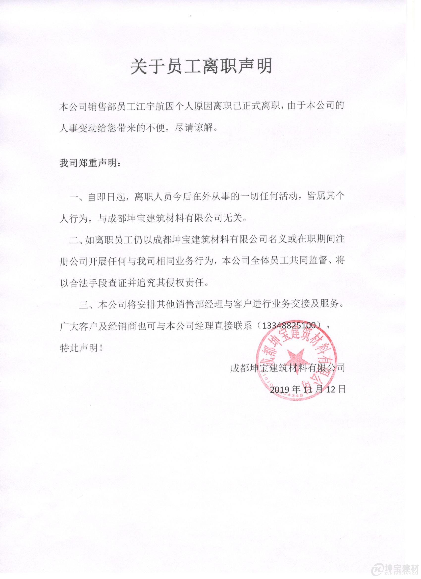 一、自即日起,離職人員今后在外從事的一切任何活動,皆屬其個人行為,與成都坤寶建筑材料有限公司無關。