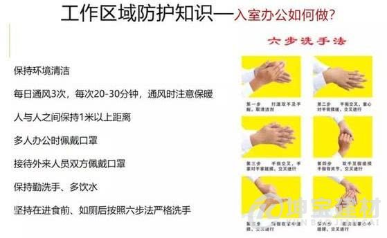 保持辦公區(qū)環(huán)境清潔,建議每日通風3次,每次20-30分鐘,通風時注意保暖。人與人之間保持1米以上距離,多人辦公時佩戴口罩。保持勤洗手、多飲水,堅持在進食前、如廁后按照六步法嚴格洗手。接待外來人員雙方佩戴口罩。