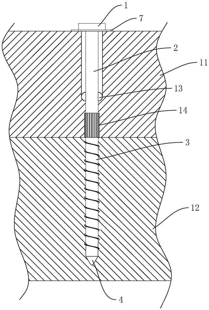 圖中,1、螺釘帽;111、十字槽;2、光桿部;3、螺紋部;4、燕尾頭;5、排屑槽;6、螺紋擴孔刀;7、墊片;8、防滑齒;9、螺紋;10、螺紋排屑塊;11、樹脂瓦;12、搭條;13、擴孔刀;14、限位凸齒。