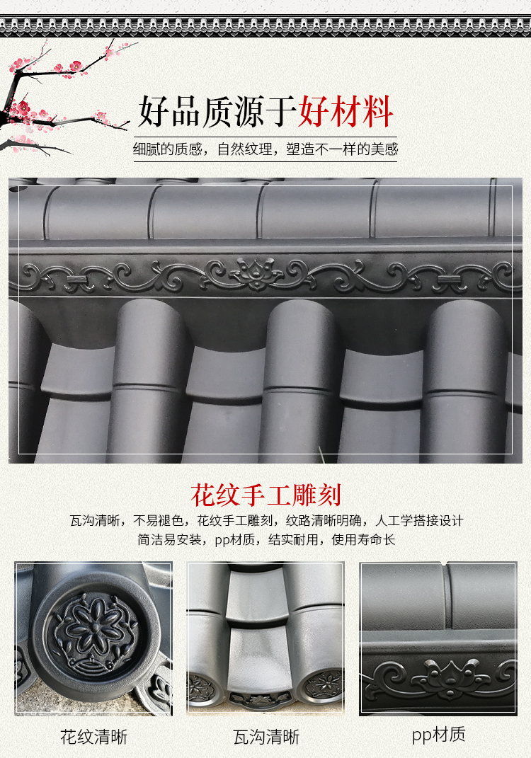 毫無疑問,仿古一體瓦是由PVC聚乙烯加ASA,再輔助工具加上增稠劑,阻燃劑,及其CPE,ACR等原材料,及其小量碳酸鈣粉提升抗壓強度。這里邊的配制尤為重要。原料的成本費不一,占比不一,價錢天差地別!四、水電工程人力成本:地域不一樣,人工成本不一樣,其實大伙兒都明白,相距個幾毛甚為一切正常!五、樹脂粉價錢:聚氯乙烯樹脂粉銷售市場上價錢有好壞。一些逃避責(zé)任的生產(chǎn)廠家甚至是很多應(yīng)用再造PVC顆粒料生產(chǎn)制造水泥瓦,價錢相差太大可見一斑!
