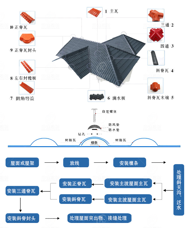 合成樹脂瓦在總結國內(nèi)外同類產(chǎn)品經(jīng)驗的基礎上進行了創(chuàng)新,它突出的特點是色彩豐富并經(jīng)久不褪,造型美觀立體感強且符合中國建筑文化特色。同時它還具有質(zhì)輕、防水、堅韌、保溫、隔音、防腐蝕、抗風防震、抗冰雹、抗污染、防火、絕緣、安裝簡便等優(yōu)點,是各類建筑表面裝飾和防水的理想材料平改坡工程。