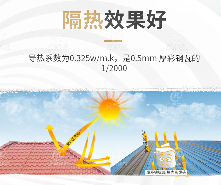 合成樹脂瓦正以快速度發展成為現代化屋面瓦產品中很優秀的一個產品,如何把產品更進一步的升級優化,在經過樹脂瓦廠家坤寶匠人的專研和專注實驗后,工字紋理合成樹脂瓦產品以技術和品質為保證誕生了,產品的實際質量和性能得到進一步提升,同時也以優秀的裝飾性能為用戶帶來更高質的使用享受。