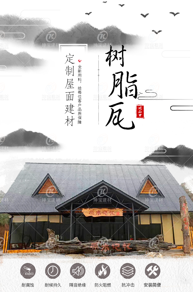 《坤寶牌》合成樹脂屋面瓦,原料采用高耐候性ASA樹脂研制,中間是發泡隔熱骨架層,底層為高強度耐磨層。防腐耐候性能**,承載力好,能夠抵擋酸堿鹽侵蝕,化工廠房及污染惡劣環境都適用。由于合成樹脂屋面瓦屬于高分子聚合物,本身瓦面就致密不吸水,大大提升防水效果,而且具有荷葉效應,灰塵雜物等不容易堆積在屋面上,減輕了瓦面的負擔及房梁的承重,還可延長了合成樹脂屋面瓦的使用壽命。