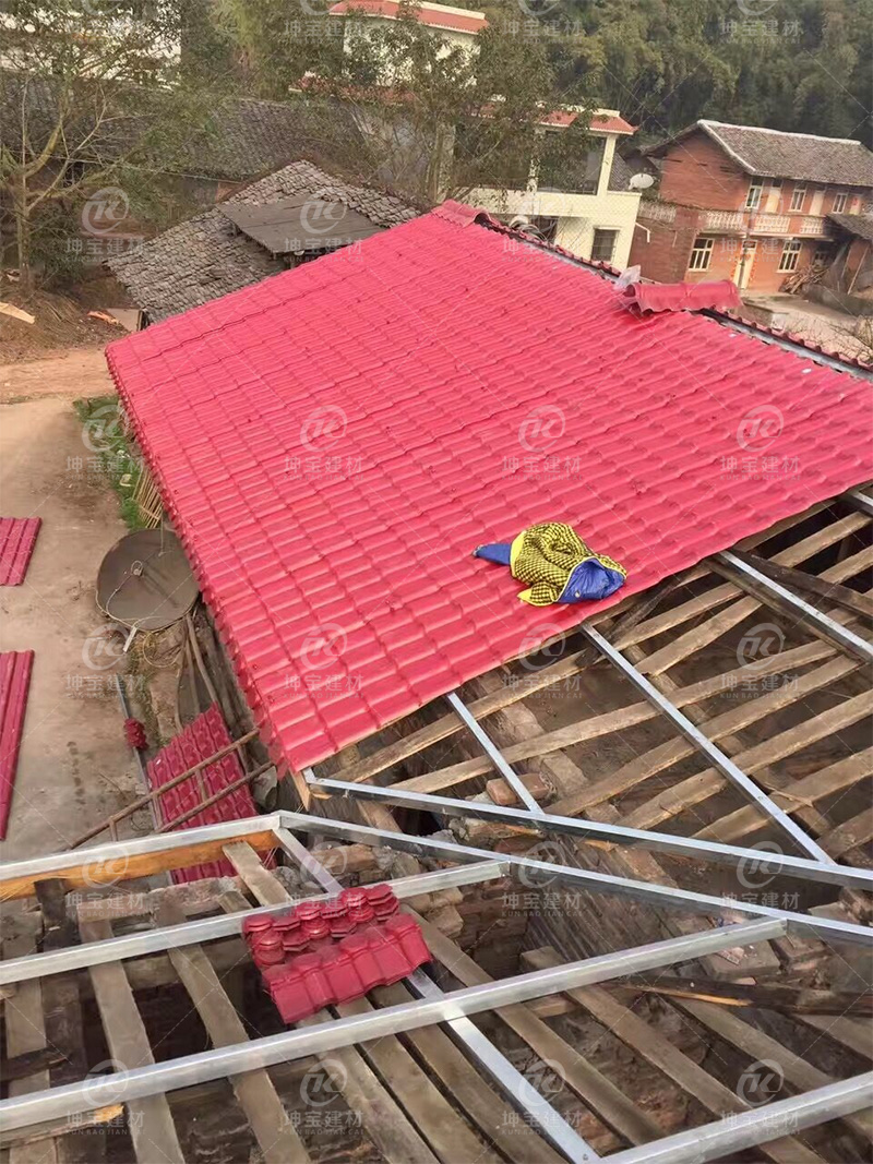 2020年根據農村計劃合成樹脂瓦改造換新顏,現再好多農村基本上都是家家戶戶自己老房的小青瓦房,自拆自建起來的新房子,有的樹脂瓦用在別墅上,有的用在平房上,兩坡流水居多,然后就是四面流水的合成樹脂瓦屋面,下面就是客戶拍照回來的紅色樹脂瓦安裝效果圖。